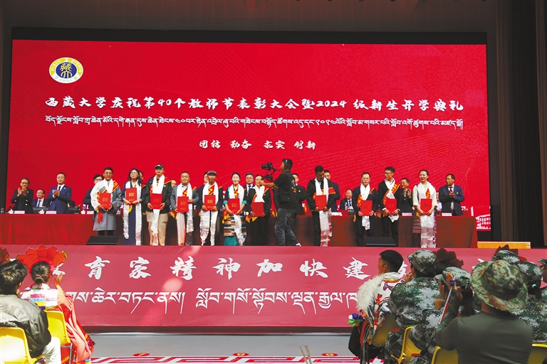 10日下午,西藏大學在納金校區(qū)雙創(chuàng)活動中心舉辦第40個教師節(jié)表彰大會暨2024級新生開學典禮。活動在熱情歡快的暖場歌舞中拉開帷幕,會場內紅旗飄揚,氣氛熱烈而莊重,全體2024級新生、學校各單位主要負責人、受表彰師生代表等共計3300余師生齊聚一堂,共同見證這一重要時刻。