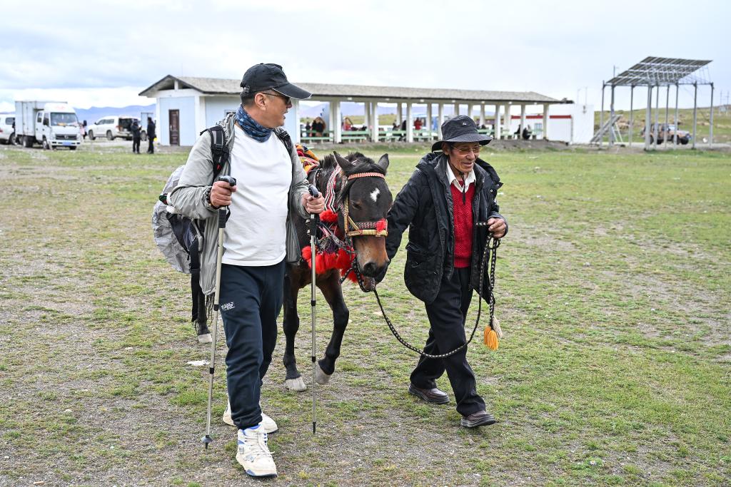 9月8日,在普蘭縣巴嘎鄉(xiāng)崗莎村,當?shù)卮迕裾隣恐R和游客同行。新華社記者孫瑞博 攝