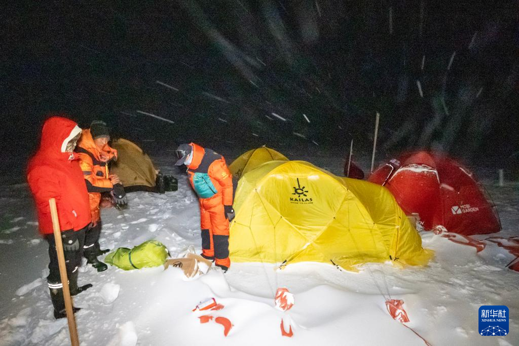 科考隊(duì)員在夜間的大風(fēng)雪中加固營地(9月11日攝)。新華社記者 姜帆 攝