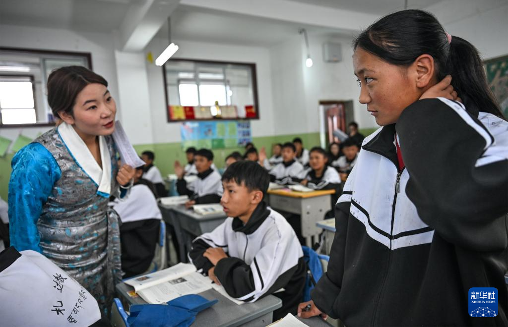 在西藏阿里地區(qū)札達(dá)縣九年一貫制學(xué)校,老師次仁曲加給初三(2)班的學(xué)生上課(9月10日攝)。新華社記者 孫瑞博 攝
