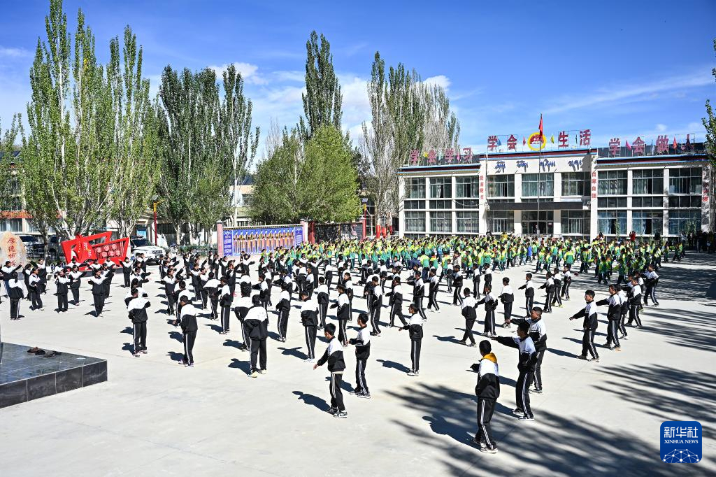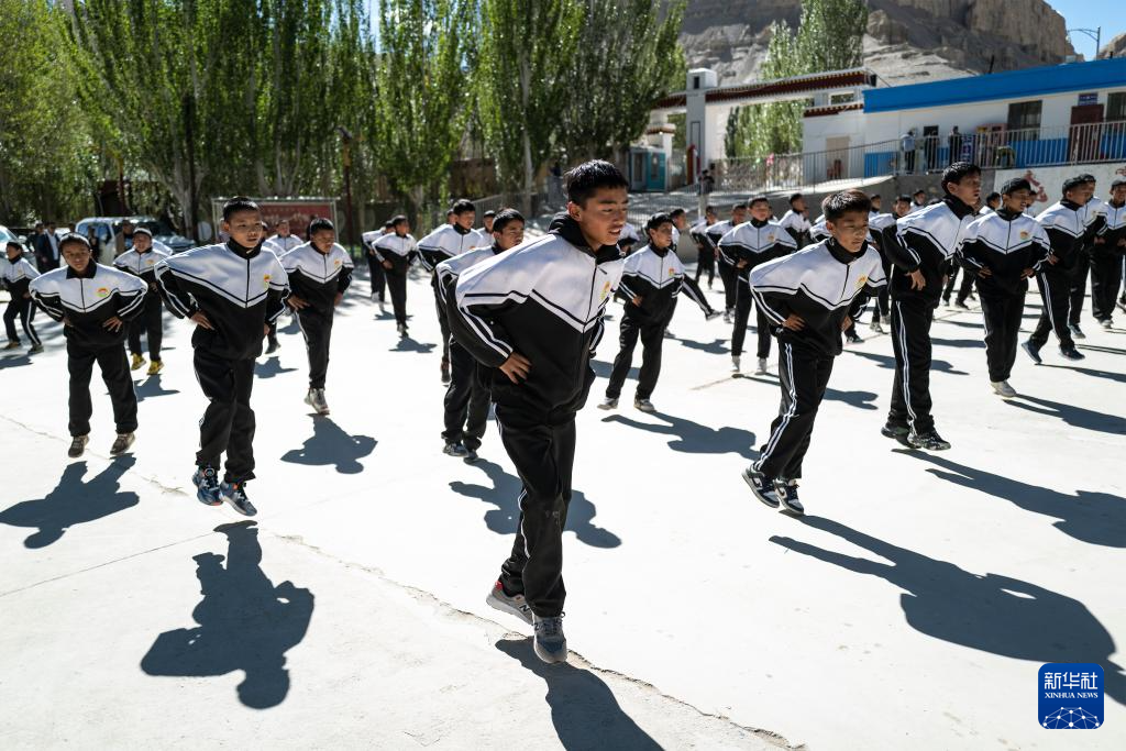 在西藏阿里地區(qū)札達(dá)縣九年一貫制學(xué)校,孩子們跳起融入國家級非物質(zhì)文化遺產(chǎn)“宣舞”特色的課間操(9月10日攝)。新華社記者 孫瑞博 攝