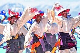 舞蹈演員在納木錯開湖活動現(xiàn)場表演。新華社發(fā)