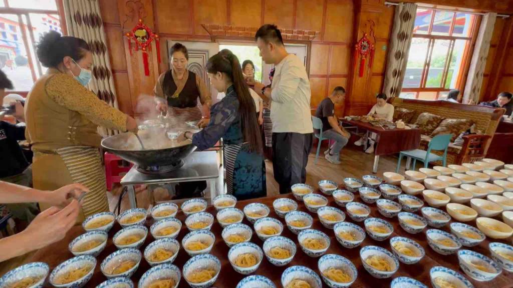 “目前店里紀錄保持在147碗?!痹诩{西民族鄉(xiāng)經營果拉叢農家樂的果拉卓瑪說,“但生活再好也不能浪費。我們會提醒客人,如果吃飽了,只需用筷子在碗上搭出尖尖,就會停止加面;但對于不搭筷子的客人,我們還會再勸一碗?!?/p>
