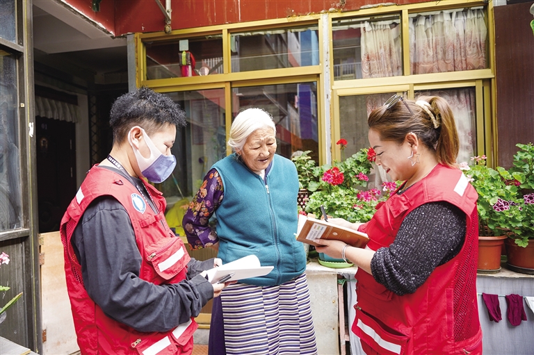 9月12日早晨9點(diǎn)半,丹杰林社區(qū)的網(wǎng)格員們身穿紅馬甲、拿著筆記本,穿梭在轄區(qū)的大街小巷?!鞍屟胱冢覀儊砝?。”“你們來得剛好,快看看我的手機(jī),這是怎么回事?”“阿媽你看要從這里退出,再打開這個(gè)就行了?!痹谖拿鞔笤?,網(wǎng)格員其美玉珍和次仁卓嘎耐心幫73歲的央宗處理遇到的問題——這是他們?nèi)粘9ぷ鞯囊粋€(gè)縮影。