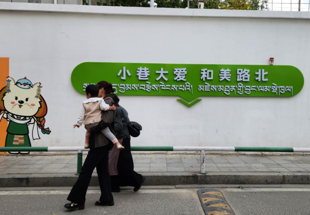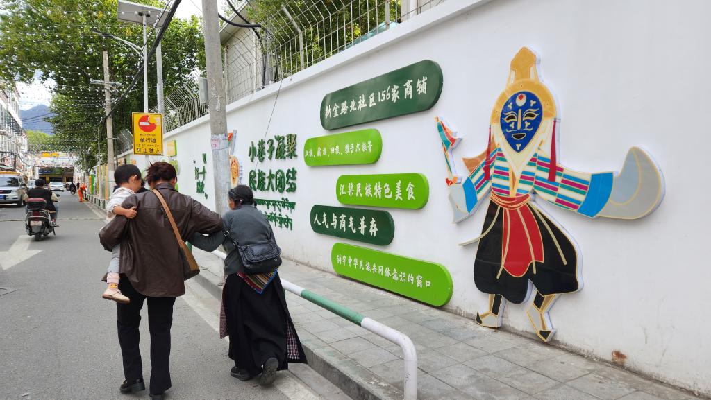 配合路政部門把洽瑪崗路改為單行道,讓街道靜下來;協(xié)同三大運營商,把街上縱橫交錯的“飛線”收進沿街橋架,還行人一片藍天;對接專業(yè)設(shè)計團隊,以本地犬種拉薩阿普索犬設(shè)計社區(qū)IP形象“嘎嘎”(意為快樂),街角的墻繪、樹上的引導(dǎo)牌、商戶的門臉上都能看到這只可愛的小狗……社工旦增晉美對社區(qū)的變化如數(shù)家珍。