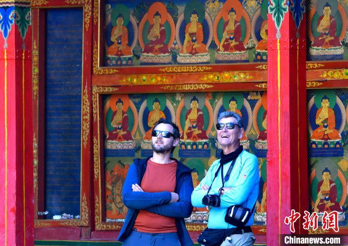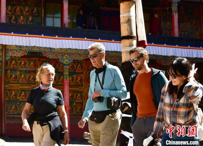 10月1日,外國(guó)游客在西藏自治區(qū)日喀則市扎什倫布寺內(nèi)參觀。國(guó)慶假期首日,始建于公元1447年的扎什倫布寺成為眾多中外游客的首選。中新社記者 李林 攝