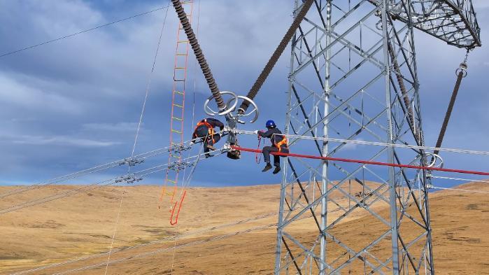 于是在接下來(lái)的幾天,記者跟隨著青藏聯(lián)網(wǎng)工程線路年檢工作人員沿著檢修輸電線路從拉薩市林周縣出發(fā)到那曲市安多縣境內(nèi),在此期間,記者經(jīng)歷了一年四季的天氣變化。9月20日,在青藏聯(lián)網(wǎng)工程西藏側(cè)林周段年檢現(xiàn)場(chǎng)2329號(hào)塔位,2名檢修人員正在40多米的高空檢查絕緣子、金具、導(dǎo)地線、引流板和間隔棒。與此同時(shí),“電力天路”上還有15名國(guó)網(wǎng)西藏電力輸電線路檢修人員同步穿梭在鐵塔與銀線之間,開(kāi)展年度檢修作業(yè)。