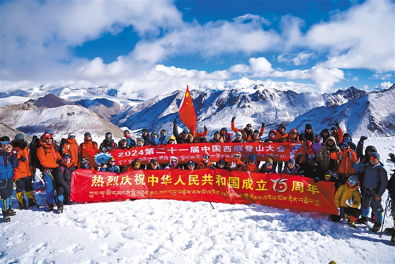 此時(shí),倘若從山腳往上看,與雄偉圣潔的雪山相比,緩緩行進(jìn)的登山者們是如此渺小,又如此頑強(qiáng)?!皼]有比人更高的山,沒有比腳更長的路?!痹陬B強(qiáng)意志的支撐下,在向?qū)У膸椭?,在挑?zhàn)中不斷超越自我,最終,絕大部分山友沖頂成功,齊聚海拔6010米的洛堆峰頂,以實(shí)際行動(dòng)慶祝中華人民共和國成立75周年。大家或在洛堆峰紀(jì)念碑前拍照打卡,或組織團(tuán)隊(duì)成員拿出提前準(zhǔn)備好的橫幅道具拍攝視頻,表達(dá)對祖國或者家人的祝福,登頂成功的喜悅洋溢在洛堆峰頂稀薄的空氣中。