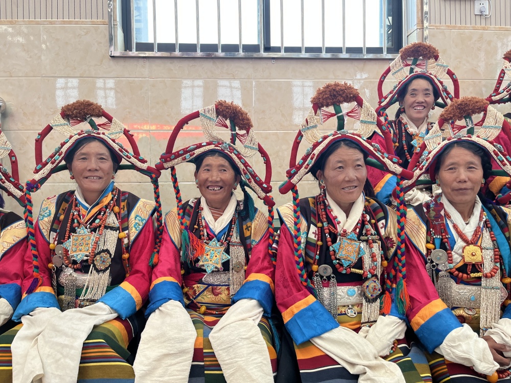 現(xiàn)在的諧欽隊(duì)共有67名成員,30歲以下的年輕人有8人,云丹卓瑪老阿媽也如愿收了一名“關(guān)門弟子”曲桑。她是諧欽隊(duì)的現(xiàn)任隊(duì)長,從事諧欽已有20多年,后被評(píng)為薩爾諧欽市級(jí)非遺傳承人?!拔覀兞η笤诒A羲_爾諧欽原汁原味的基礎(chǔ)上,在舞步與服飾上有所改進(jìn),更好地展現(xiàn)當(dāng)代農(nóng)牧民的風(fēng)采。”她說。