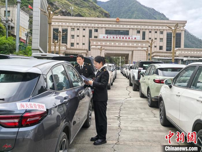 圖為在吉隆口岸,海關(guān)工作人員驗放車輛。資料圖 拉薩海關(guān) 供圖