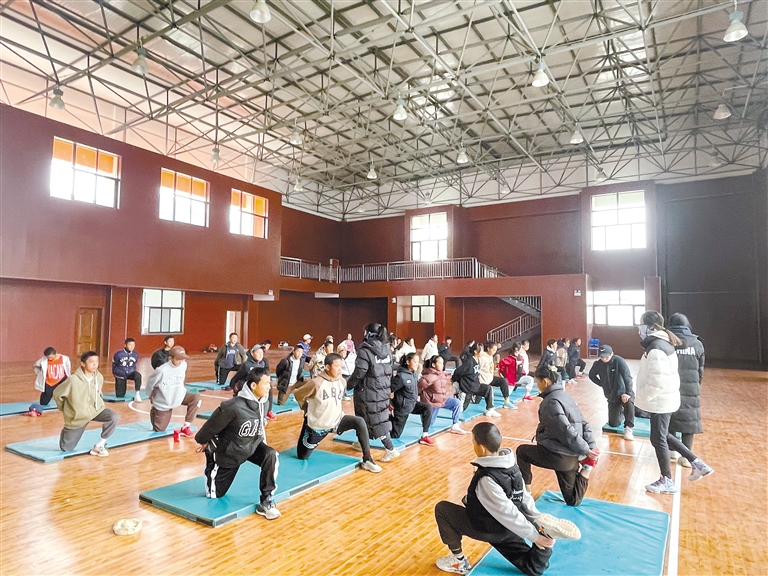 圖為支教隊(duì)員帶領(lǐng)孩子們進(jìn)行室內(nèi)訓(xùn)練?!?/p>