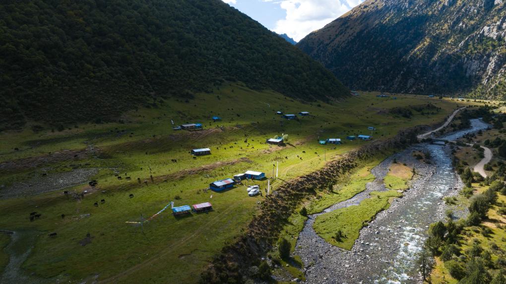 貢喬熱旦家夏季牧場(chǎng)的全貌(無人機(jī)照片,9月4日攝)。新華社記者 丁增尼達(dá) 攝