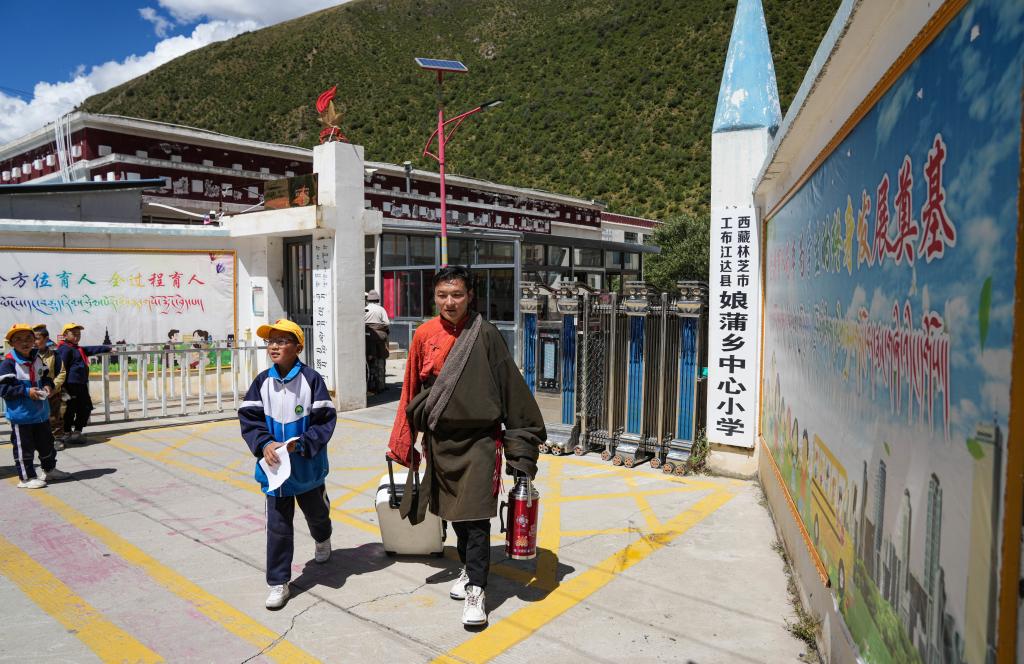 娘蒲鄉(xiāng)中心小學(xué)門口,王登領(lǐng)著兒子貢喬熱旦(左)準(zhǔn)備回家(9月4日攝)。新華社記者 晉美多吉 攝
