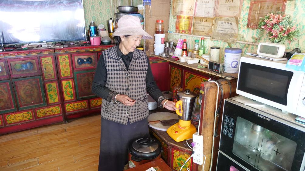 對瓊國來說,生活中變化極大的就是生產(chǎn)酥油。“用電動酥油機,一桶奶幾分鐘就能打完,太省事了!”瓊國家的冰箱里如今常備著二十幾斤酥油。電動酥油機“上崗”后,酥油桶就閑置了。