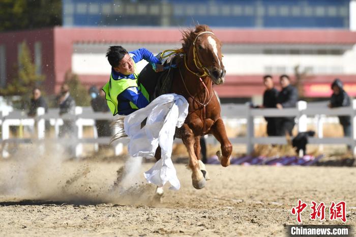 27日,由西藏自治區(qū)體育局、西藏自治區(qū)體育總會(huì)主辦,西藏自治區(qū)社會(huì)和民族傳統(tǒng)體育指導(dǎo)管理中心承辦的2024年西藏自治區(qū)青少年民族傳統(tǒng)馬術(shù)比賽在拉薩市北郊賽馬場(chǎng)舉行。本次比賽共有30余名運(yùn)動(dòng)員,40余匹馬參賽,比賽共設(shè)民族賽馬和傳統(tǒng)馬術(shù)2個(gè)大項(xiàng)5個(gè)小項(xiàng)。圖為西藏青少年民族傳統(tǒng)馬術(shù)比賽現(xiàn)場(chǎng)。中新社記者 貢嘎來松 攝