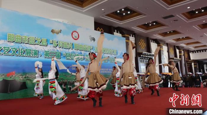 圖為班戈縣“鄉(xiāng)村振興 那曲奮進”活動成果轉(zhuǎn)化暨文藝文化展演、第三屆畜產(chǎn)品展銷會開幕式歌舞演出。洛桑斯卓 攝