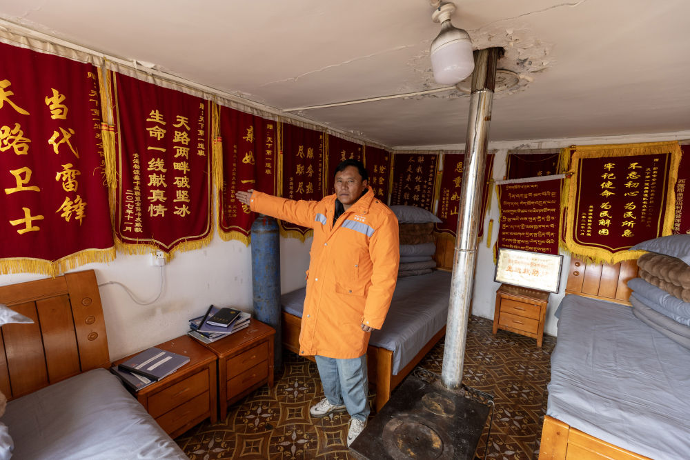 這里的救助站吸引了記者的注意。進(jìn)入房間,內(nèi)有床鋪、氧氣瓶、抗高反藥等物品,四面墻上掛滿錦旗。一封毛筆書寫的紅底感謝信格外顯眼,信中表達(dá)了對地嘎、東力、次仁多吉三名養(yǎng)路工人的感謝。信中寫道:“在那漫長的10個小時里,你們不顧危險和疲憊,想盡辦法讓我脫險?!?/p>