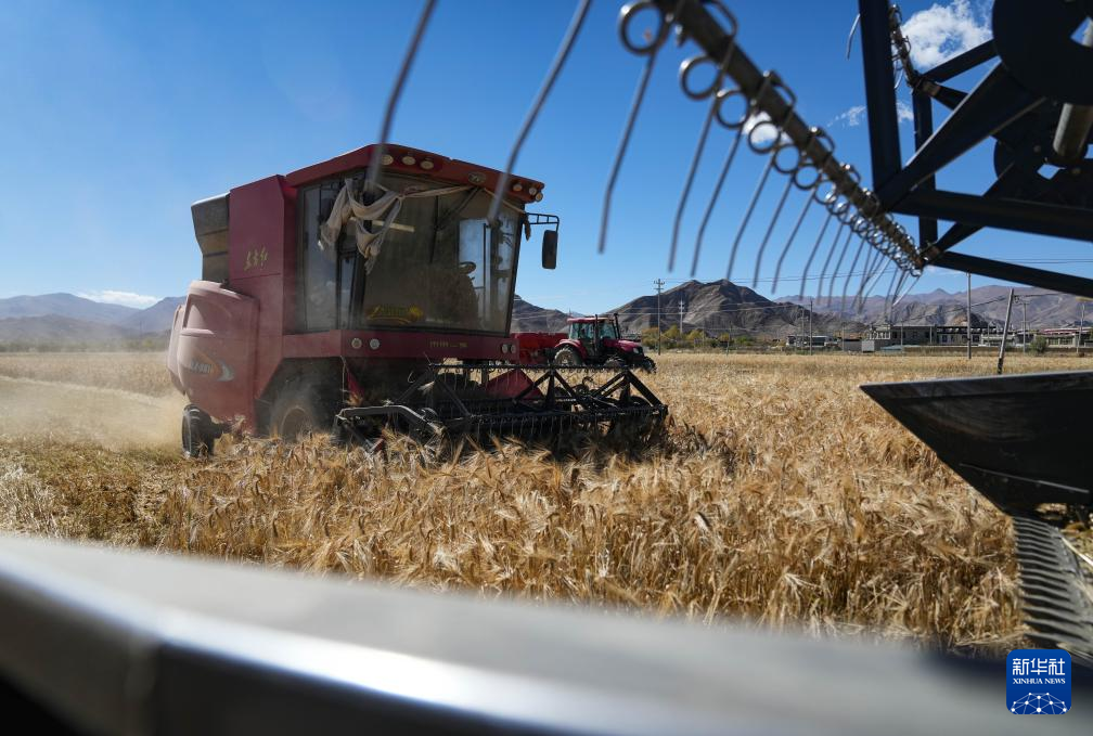 西藏日喀則市江孜縣江熱鄉(xiāng)班覺倫布村農(nóng)機(jī)服務(wù)農(nóng)民專業(yè)合作社的社員使用農(nóng)機(jī)收獲青稞(10月16日攝)。新華社記者 晉美多吉 攝