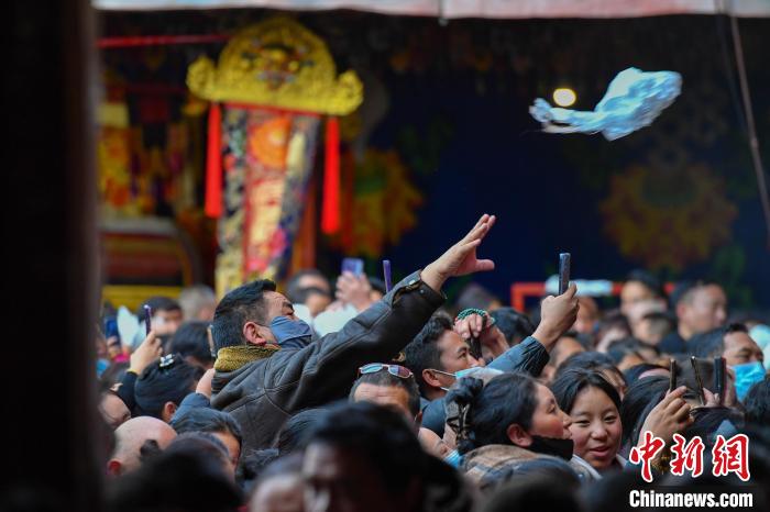 圖為12月15日,信眾在大昭寺拋獻哈達,祈福。中新社記者 貢確 攝