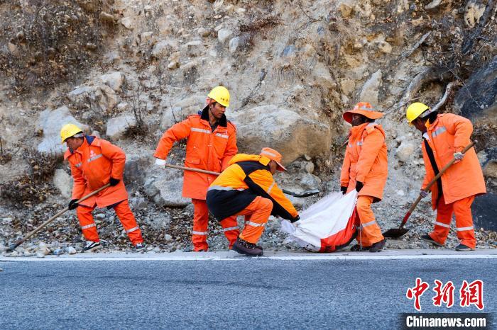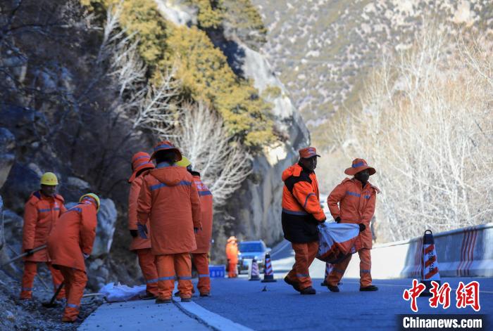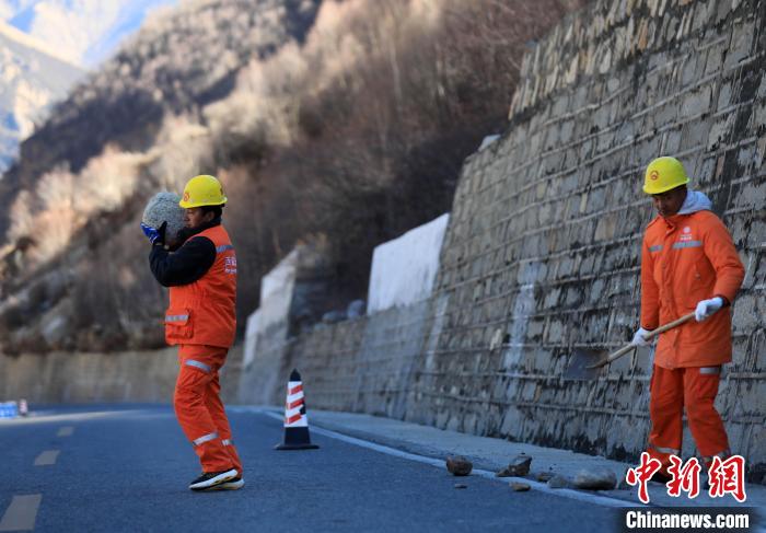 12月16日,西藏自治區(qū)林芝公路事業(yè)發(fā)展和應(yīng)急保障中心(工布江達(dá)養(yǎng)護(hù)段)道路養(yǎng)護(hù)工人及時(shí)清除川藏公路上的落石,保障道路暢通。該養(yǎng)護(hù)段擔(dān)負(fù)著川藏公路沿線工布江達(dá)縣路段的養(yǎng)護(hù)管理、應(yīng)急搶險(xiǎn)等工作,包括路面修補(bǔ)、清理邊溝、維護(hù)交通安全設(shè)施等日常養(yǎng)護(hù)工作。圖為道路養(yǎng)護(hù)工人清理公路上的落石。中新社記者 貢嘎來松 攝