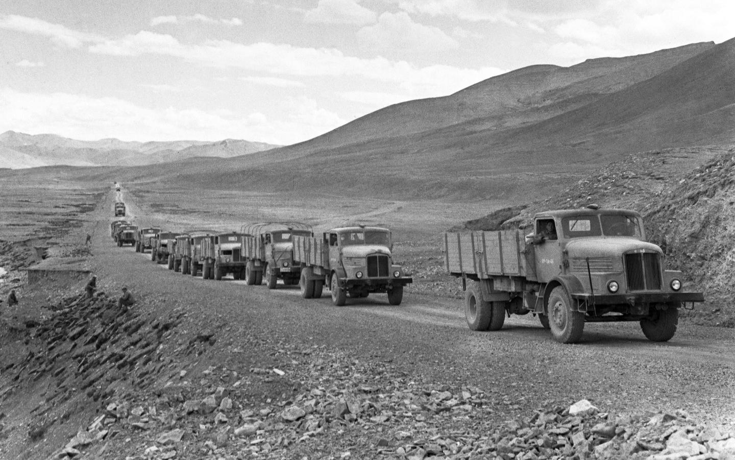 1958年,汽車隊(duì)行進(jìn)在青藏高原上。