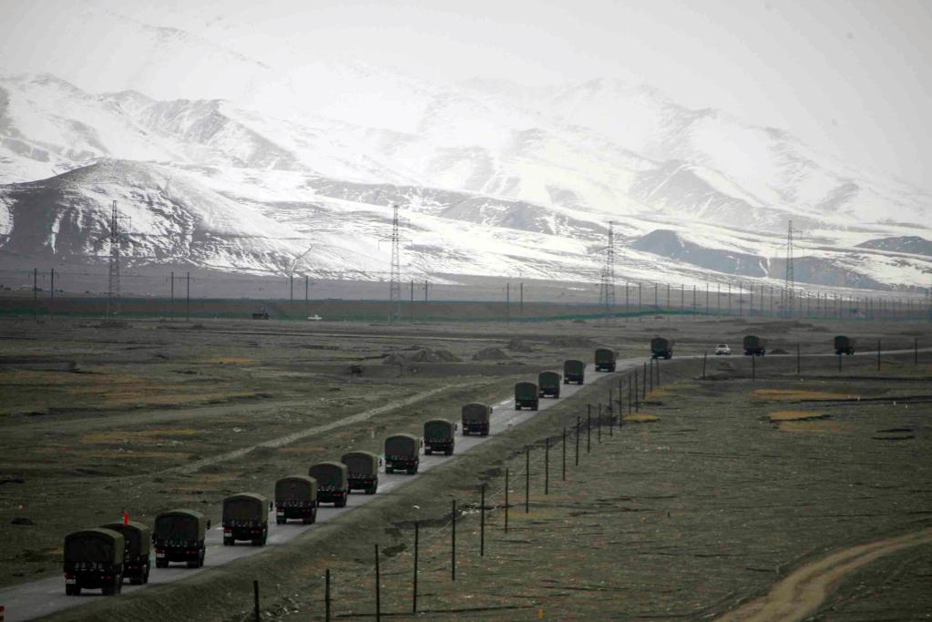 2014年9月24日,運(yùn)輸車隊(duì)行進(jìn)在青藏公路青海玉珠峰下。