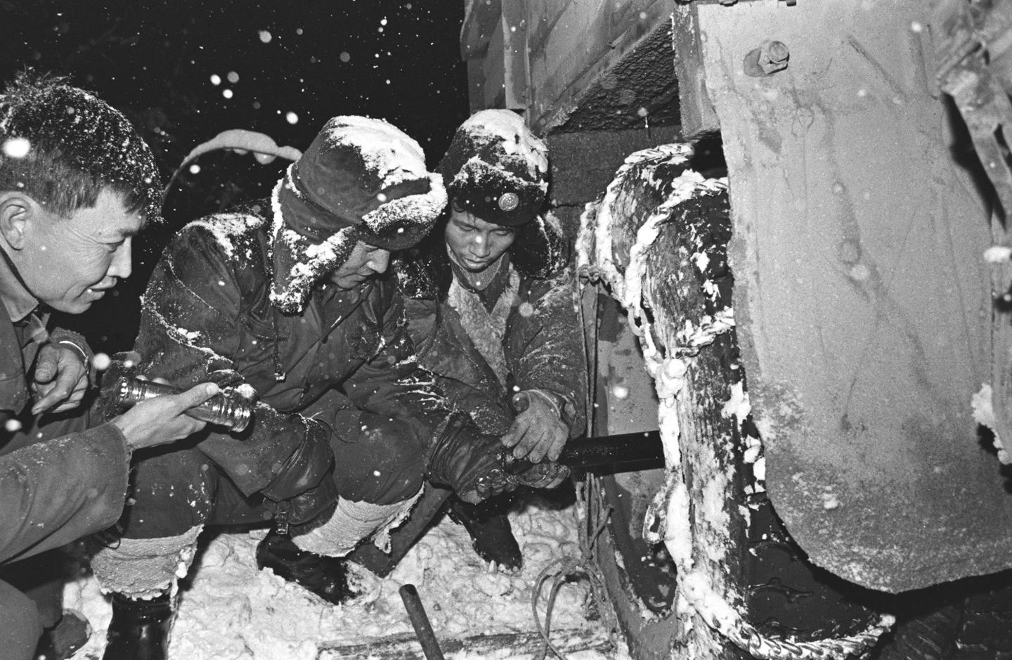 1985年3月中旬的一場罕見大雪中,川藏公路二郎山交通安全管理小組成員連夜搶修滿載援藏物資的運(yùn)輸車輛。