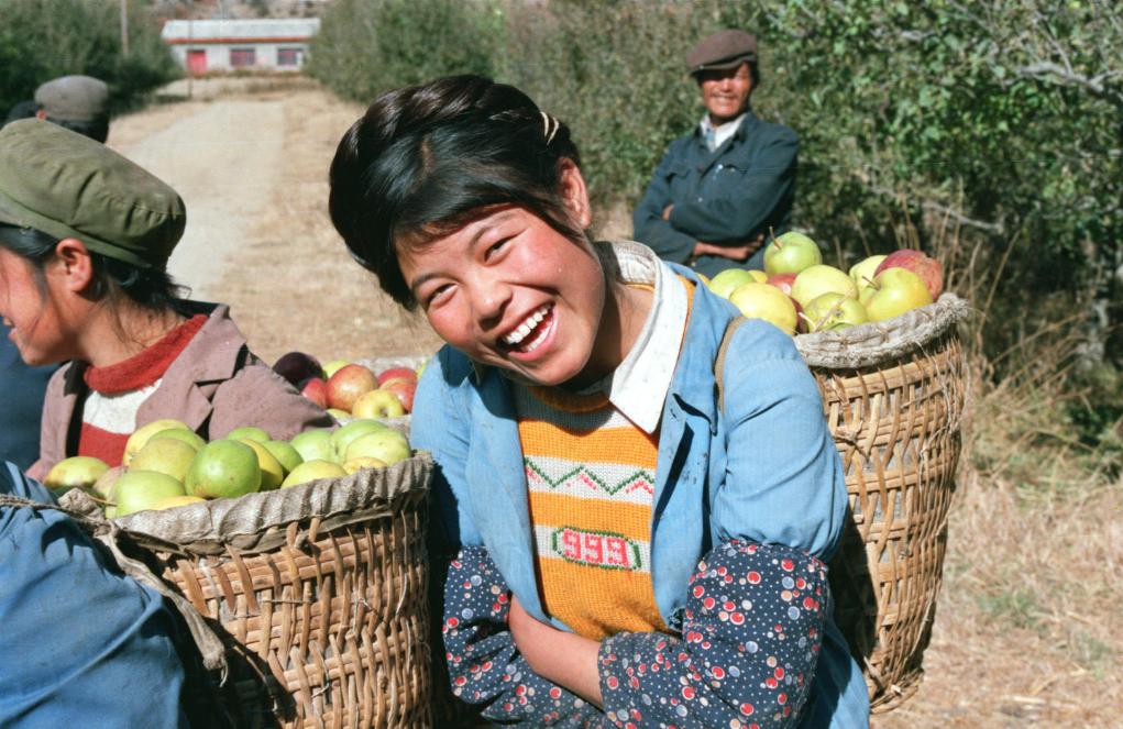 1990年,川藏公路附近,藏族女青年在背運(yùn)蘋果。
