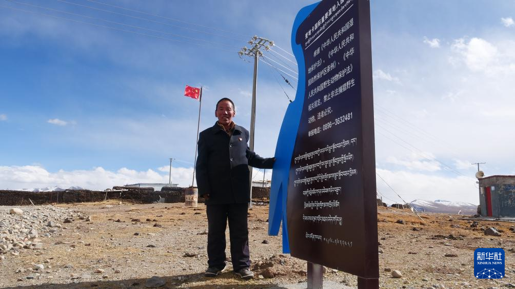 多杰才覺(jué)站在麥地卡濕地入園須知牌旁,背后是他升起的國(guó)旗。新華社記者 魏冠宇 攝