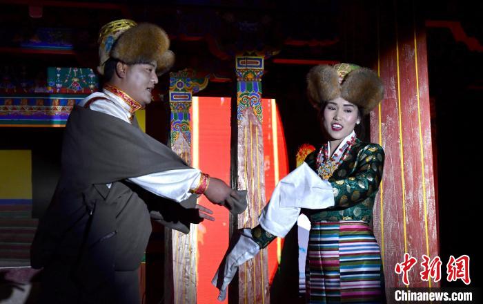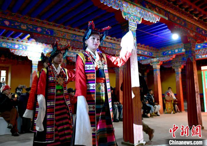 1月2日晚,一場視聽結(jié)合、感官沉浸的拉薩傳統(tǒng)演藝服飾秀在西藏自治區(qū)拉薩市喜德林古建大院上演。囊瑪堆諧、覺木隆藏戲等非遺的演繹,讓觀眾領(lǐng)略到拉薩深厚的文化底蘊。圖為拉薩傳統(tǒng)演藝服飾秀演出現(xiàn)場。中新社記者 李林 攝