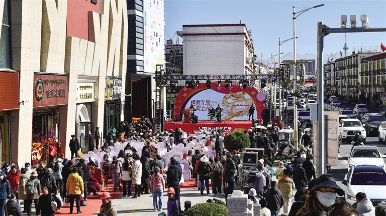 1月1日,拉薩神力時代廣場歷經(jīng)7個月左右的裝修升級后,正式恢復(fù)營業(yè),首日銷售額突破300萬元,客流量高達(dá)4.26萬人次。開業(yè)儀式現(xiàn)場人頭攢動、熱鬧非凡,不少市民早早來到商場外,期待一睹新面貌?!拔壹揖驮诟浇郧凹依锶撕軔酃溥@個商場,相信這次裝修升級后,會帶給我們?nèi)碌南M體驗?!崩_市民貢先生說。