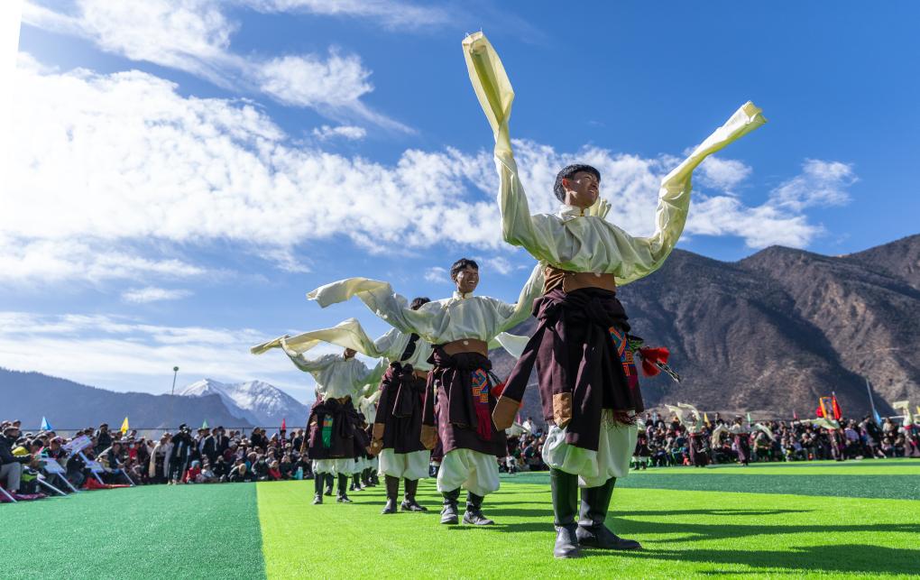 在馬利鎮(zhèn)“云中球場”,當(dāng)?shù)厝罕娫谇蛸愰_幕式上表演舞蹈(1月2日攝)。新華社記者 丁增尼達 攝