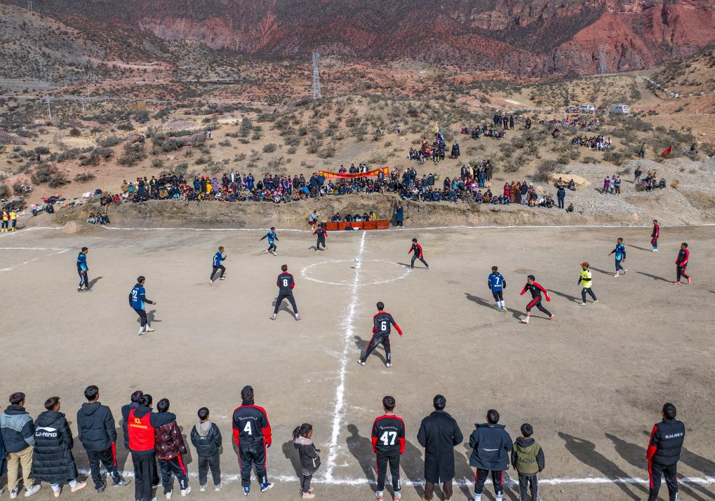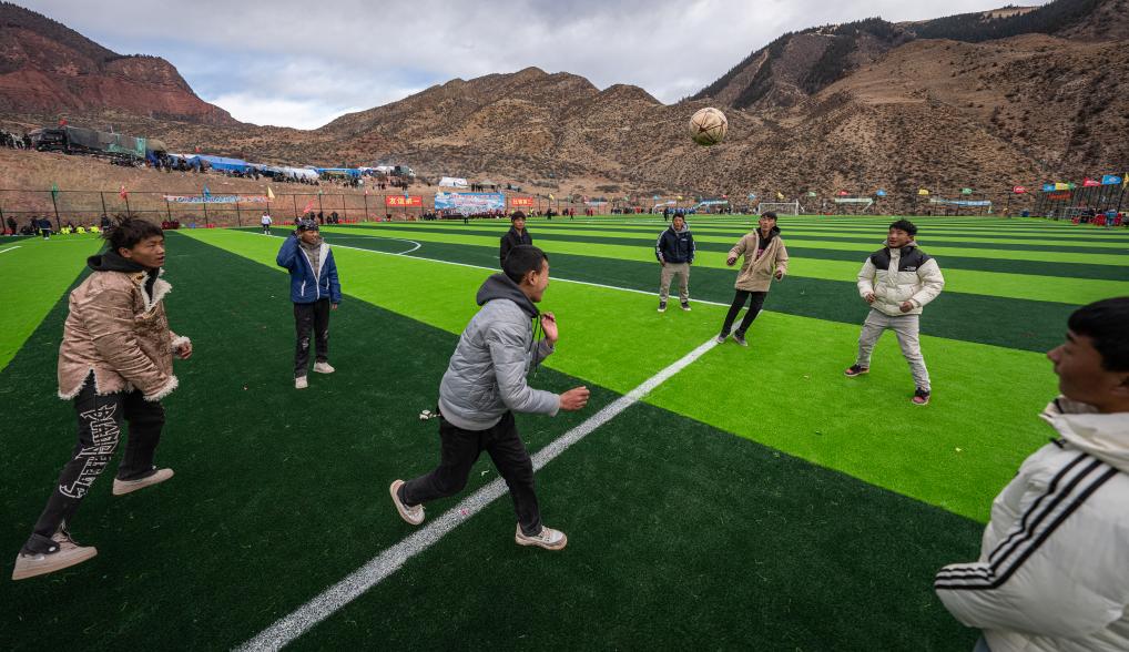 在馬利鎮(zhèn)“云中球場”,幾名球迷趁著球賽間隙踢球玩耍(1月2日攝)。新華社記者 丁增尼達 攝