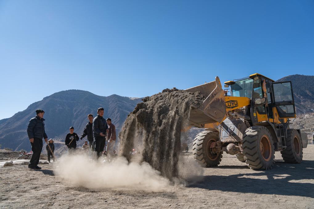 在馬利村的足球場上,球員嘎瑪加永燈培的爸爸用裝載機平整地面(2024年1月20日攝)。新華社記者 丁增尼達 攝