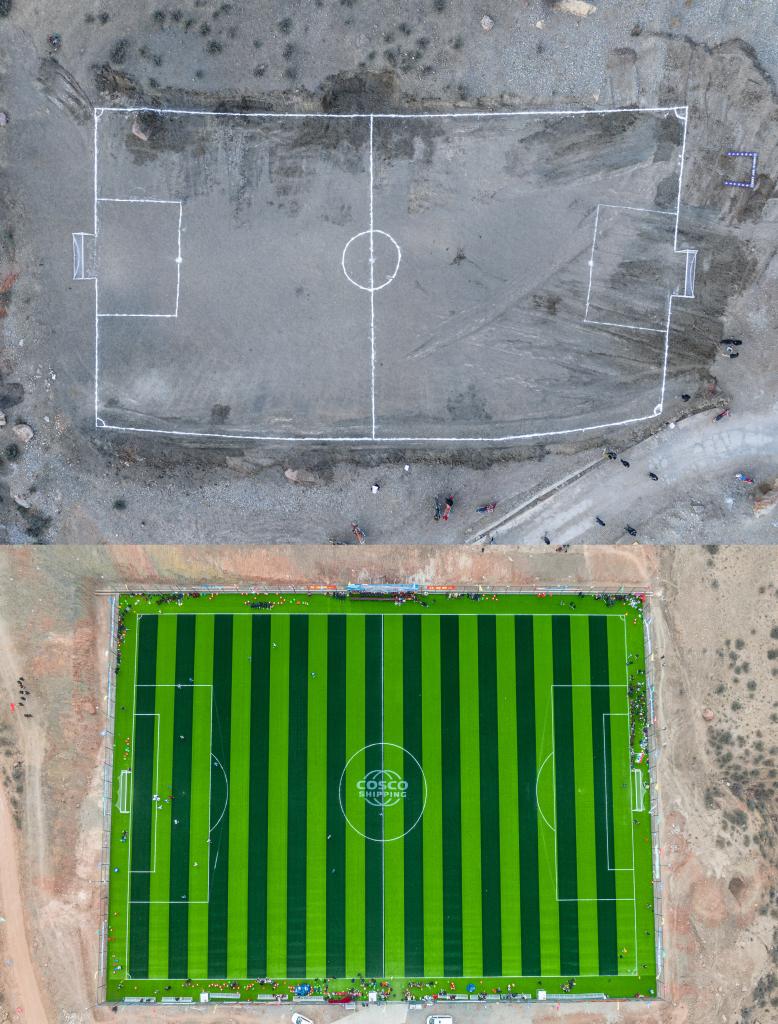 拼版照片:上圖為馬利村平整后的足球場,曾經(jīng)馬利鎮(zhèn)多項賽事都是在這片簡易球場上進行(2024年1月20日攝,無人機照片);這是2024年12月竣工的馬利鎮(zhèn)11人制標(biāo)準(zhǔn)化足球場“云中球場”(2025年1月3日攝,無人機照片)。新華社記者 丁增尼達 攝