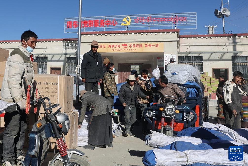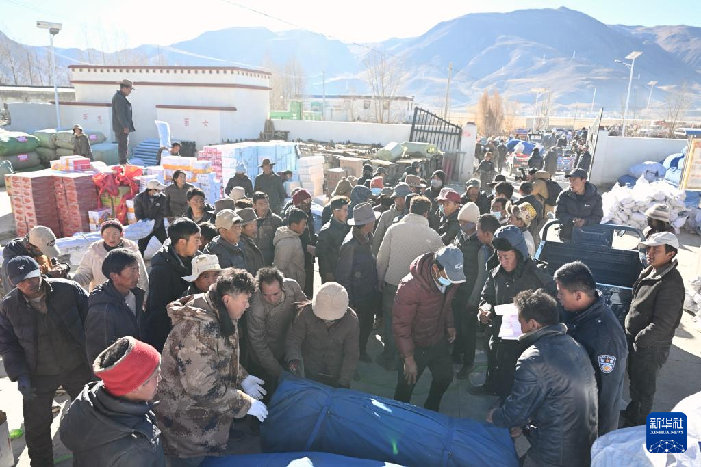 1月9日,受災(zāi)群眾在措布村村委會(huì)領(lǐng)取救災(zāi)物資。新華社記者 姜帆 攝
