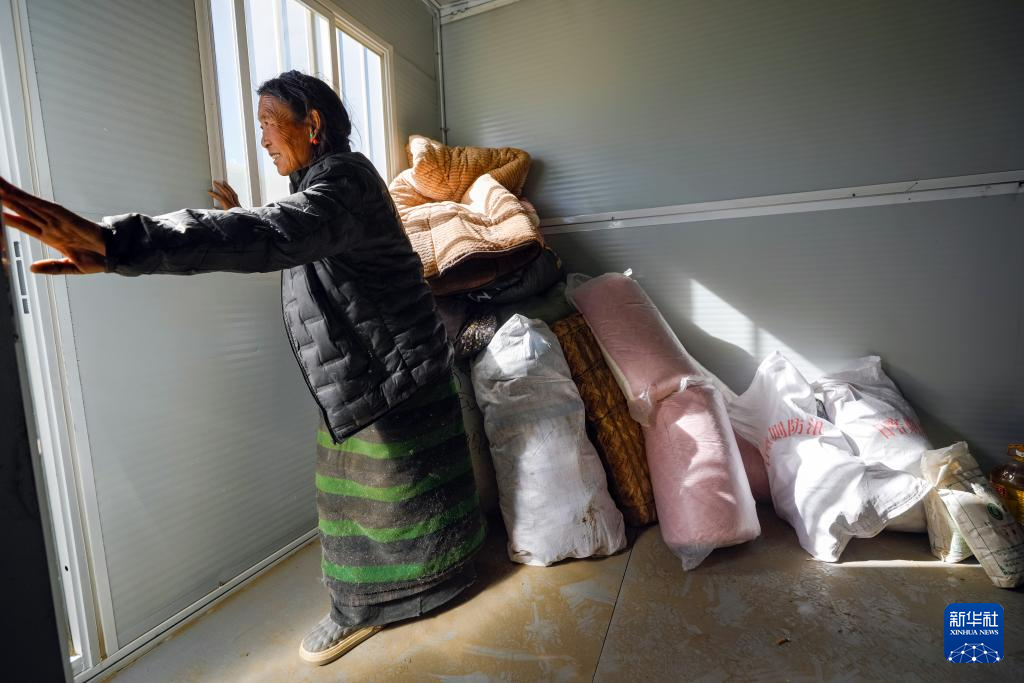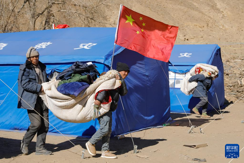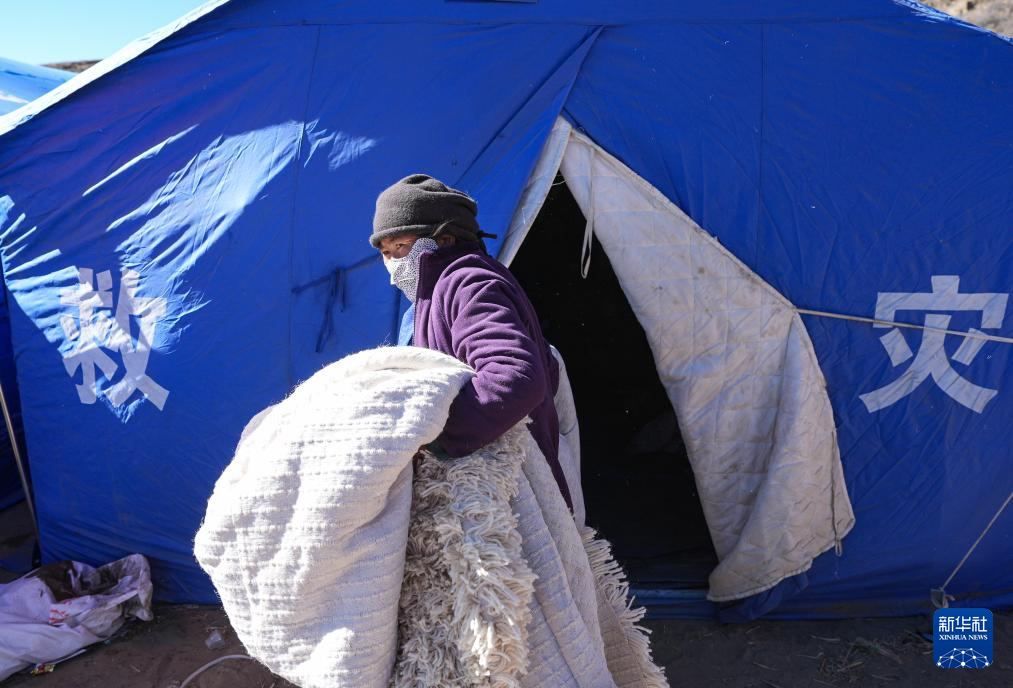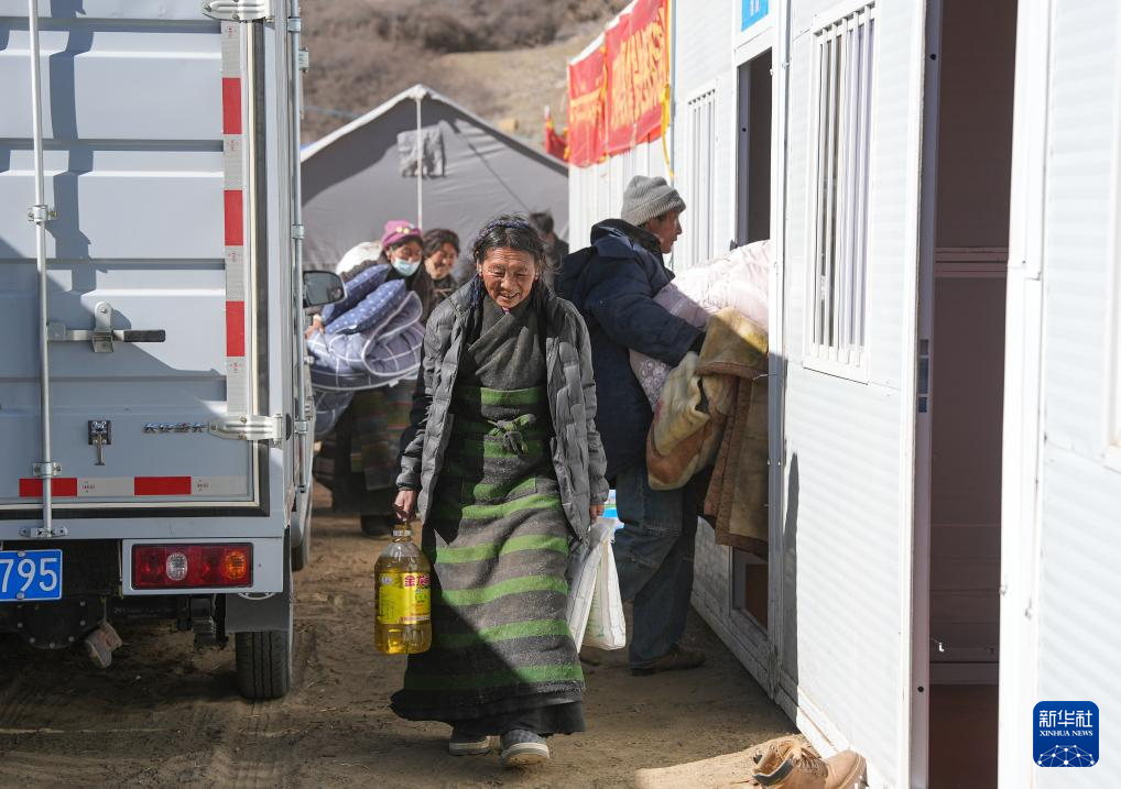 1月10日,在定日縣長所鄉(xiāng)古榮村,受災群眾將過冬物資從臨時安置帳篷搬入板房。新華社記者 沈伯韓 攝