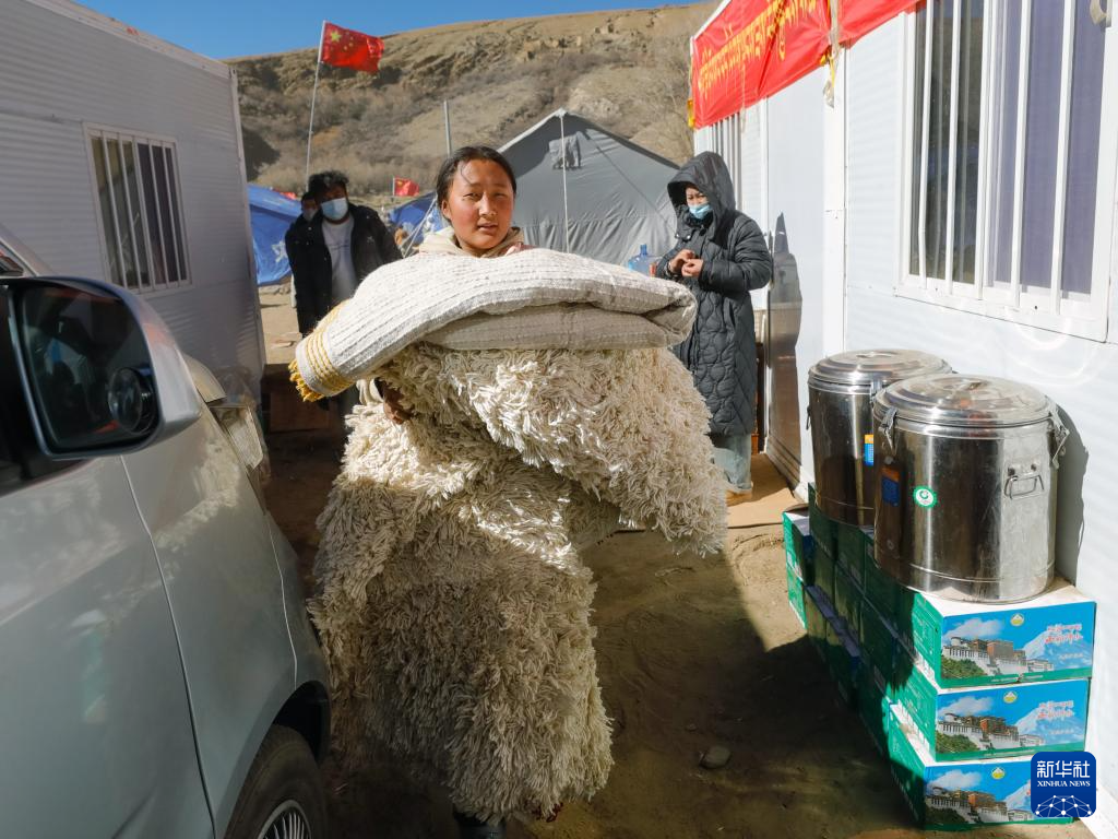 1月10日,在定日縣長所鄉(xiāng)古榮村,受災群眾將領(lǐng)取到的過冬物資搬入板房。新華社記者 沈伯韓 攝