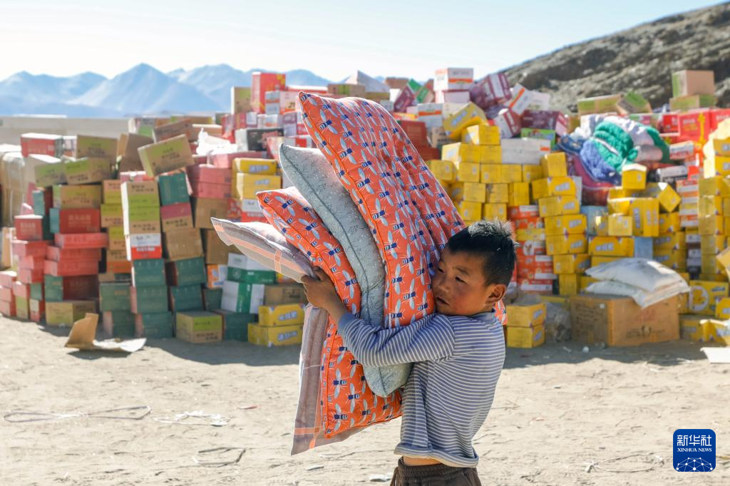 1月10日,在定日縣長所鄉(xiāng)古榮村,受災群眾領(lǐng)到生活物資。新華社記者 晉美多吉 攝