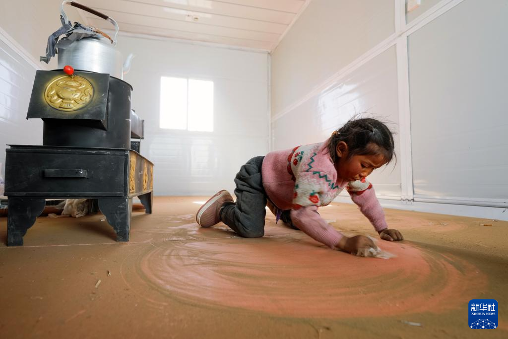1月10日,在定日縣長所鄉(xiāng)古榮村,一名小朋友搬入板房后幫助家人清理板房地板。新華社記者 沈伯韓 攝