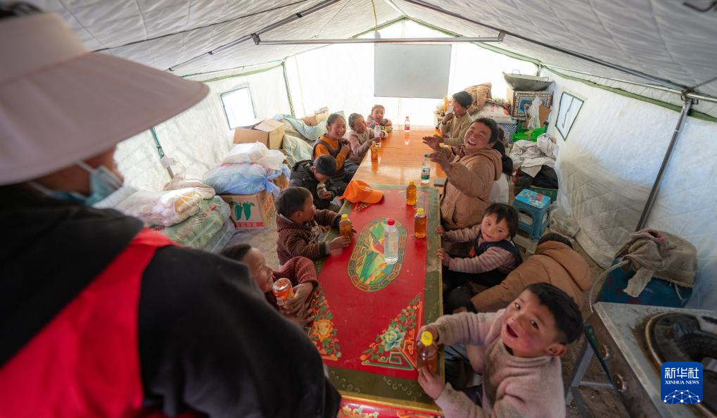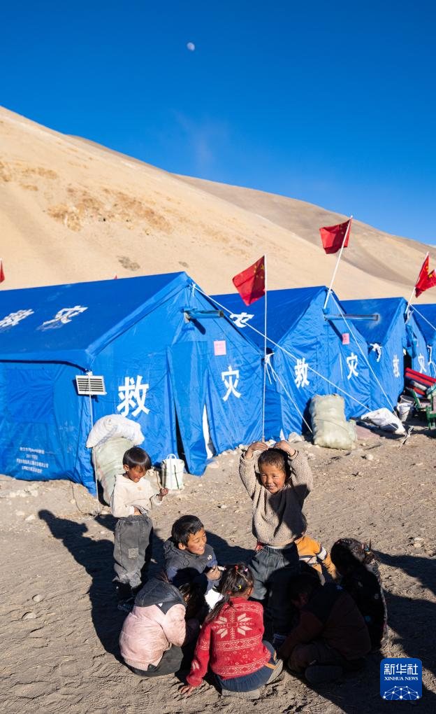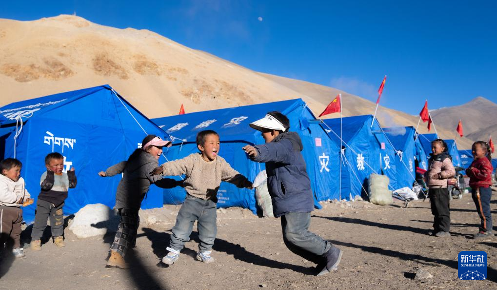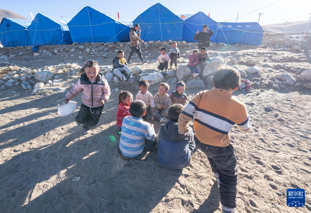 1月10日,在定結(jié)縣郭加鄉(xiāng)乃村安置點,孩子們在學(xué)生臨時學(xué)習(xí)區(qū)做游戲。新華社記者 丁增尼達(dá) 攝