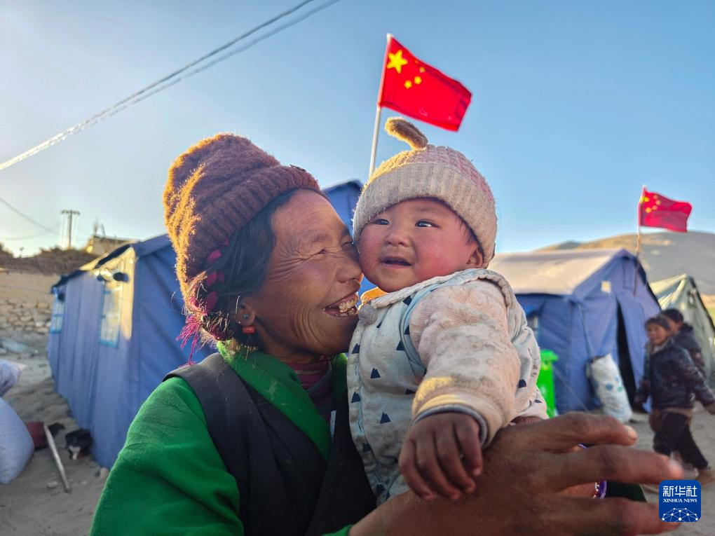 1月10日,在定結(jié)縣郭加鄉(xiāng)乃村安置點,一名老人在哄孩子。新華社記者 李華 攝