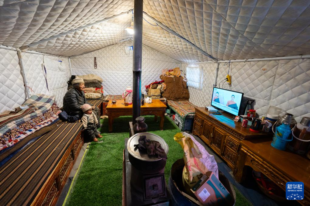1月10日,在定結(jié)縣郭加鄉(xiāng)乃村安置點,老人和孩子在救災(zāi)帳篷里看電視。新華社記者 丁增尼達(dá) 攝