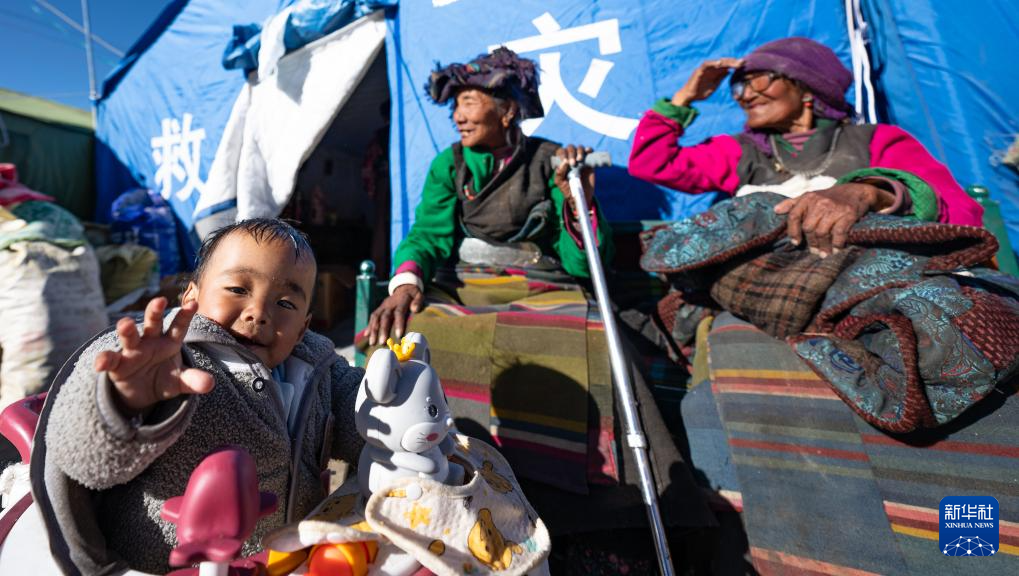 1月10日,在定結(jié)縣郭加鄉(xiāng)切村安置點,老人和孩子在救災(zāi)帳篷前休息、曬太陽。新華社記者 丁增尼達(dá) 攝