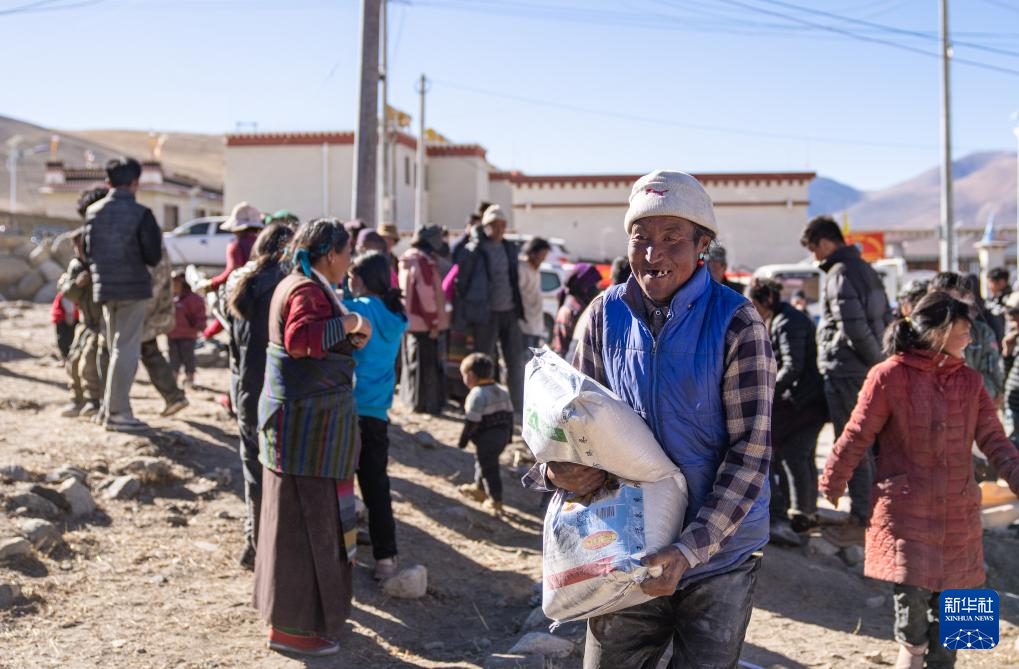 1月10日,在定結(jié)縣郭加鄉(xiāng)切村安置點,領(lǐng)到大米的老人露出笑容。新華社記者 丁增尼達(dá) 攝