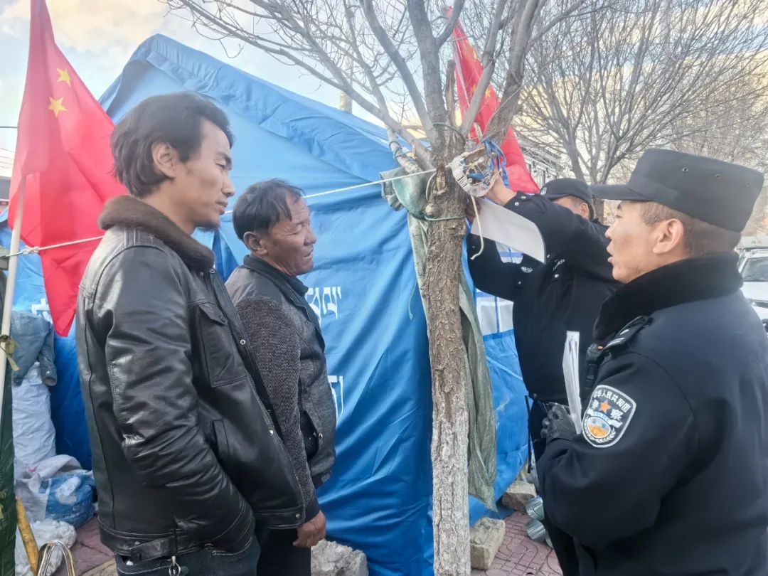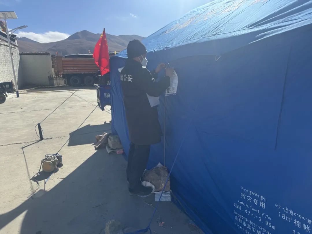 災情如令,責任重于泰山。在這場爭分奪秒與時間賽跑的抗震救災戰(zhàn)斗中,拉孜公安始終堅定地與群眾并肩同行,以“伴隨式”守護的帳篷警務室,為受災群眾筑牢安全防線。一頂頂 “帳篷警務室” 以迅雷不及掩耳之勢搭建完成,恰似一座座堅固的堡壘;一面面鮮艷的黨旗在廢墟之上獵獵作響,傲然飄揚,它們共同構成了守護受災群眾生命財產(chǎn)安全的鋼鐵長城,成為抗震救災戰(zhàn)場上一道令人動容的亮麗風景線 。