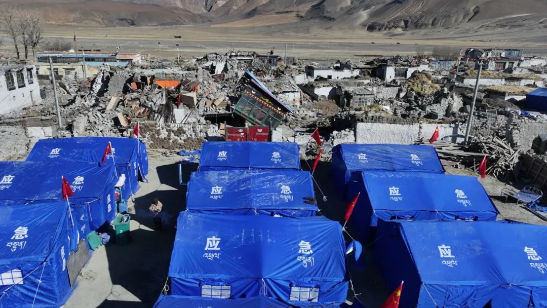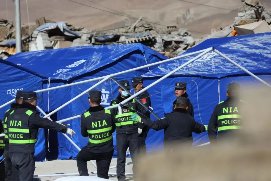 圖為日喀則邊境管理支隊(duì)民警在定日縣長(zhǎng)所鄉(xiāng)玉白村安置點(diǎn)為群眾搭建帳篷。郭遠(yuǎn)敬 攝