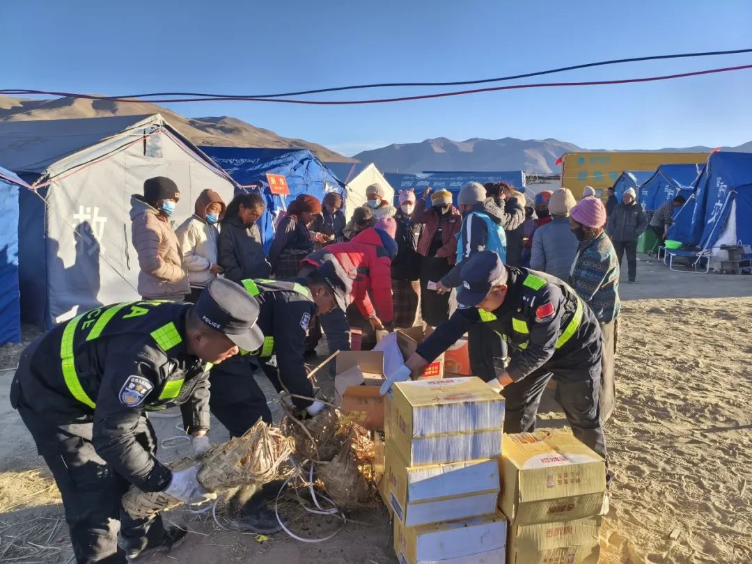 圖為在日喀則市定日縣長(zhǎng)所鄉(xiāng)嘎布村安置點(diǎn),日喀則邊境管理支隊(duì)嘎布村“帳篷警務(wù)室”民警幫助群眾卸載救災(zāi)物資。貢嘎齊平 攝