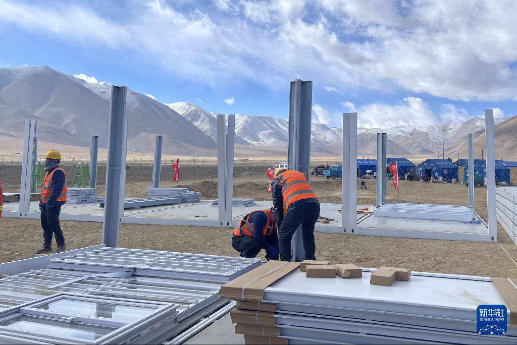 1月13日上午,中鐵二十局工作人員在定日縣措果鄉(xiāng)雪珠村安置點搭建活動板房。新華社記者蔣夢辰 攝
