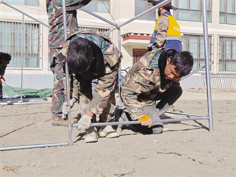 1月13日,拉孜縣芒普鄉(xiāng),4名身穿迷彩大衣的青年,正在救災(zāi)物資間穿梭,稚嫩的臉上帶著與年齡不相符的沉穩(wěn)與堅毅。